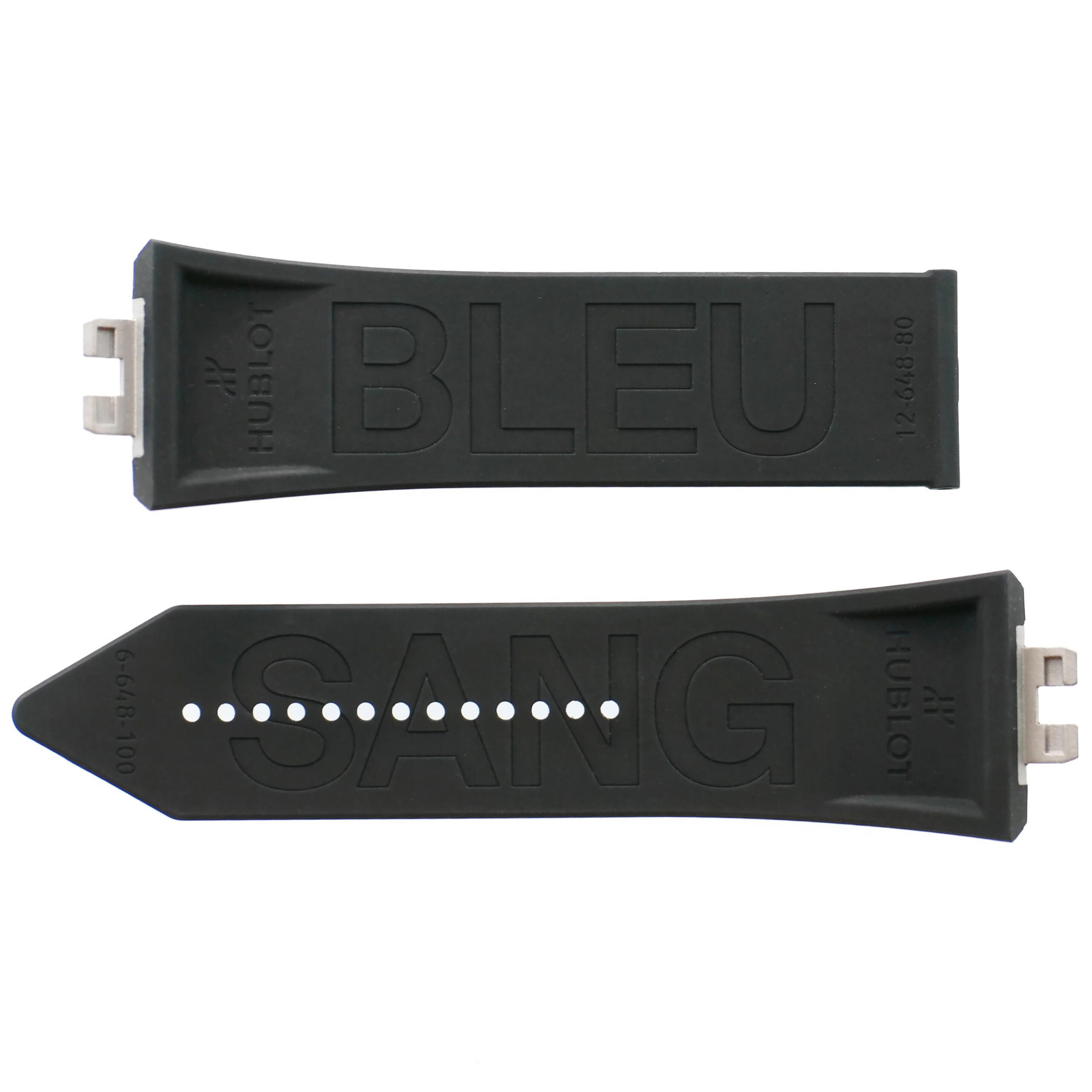 The strap is marked with the Hublot logo, HUBLOT | SANG BLEU | 6-648-100 | 12-648-80.
