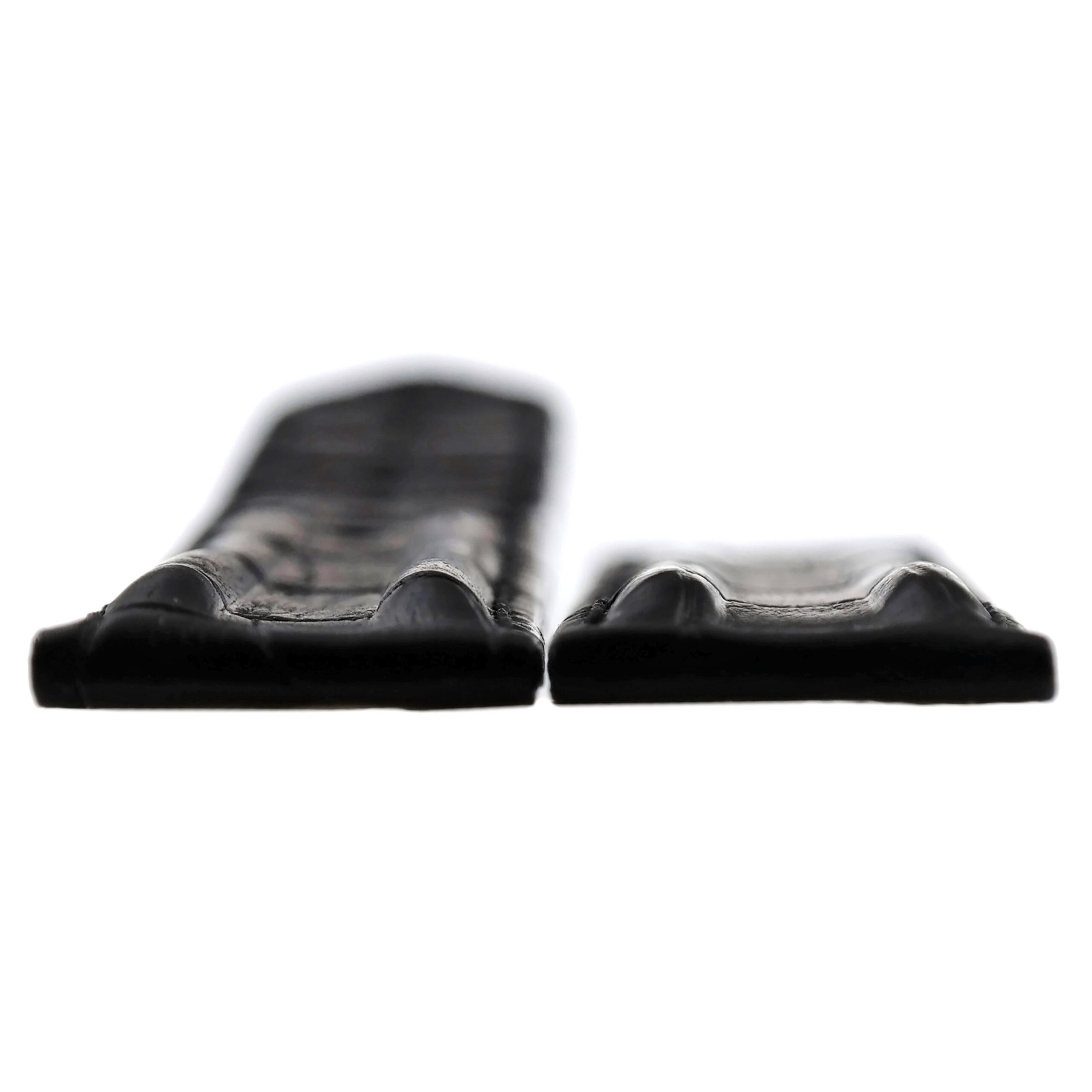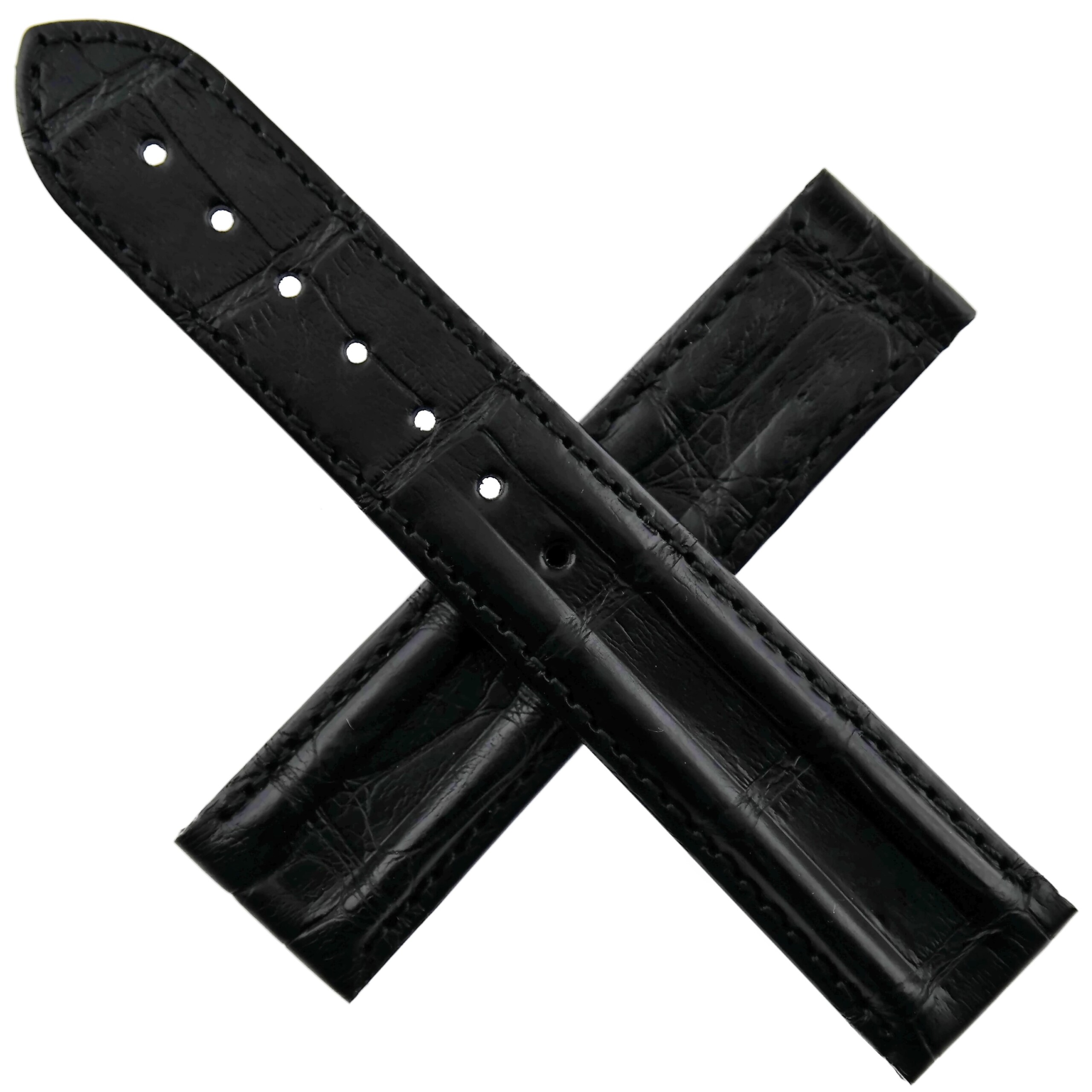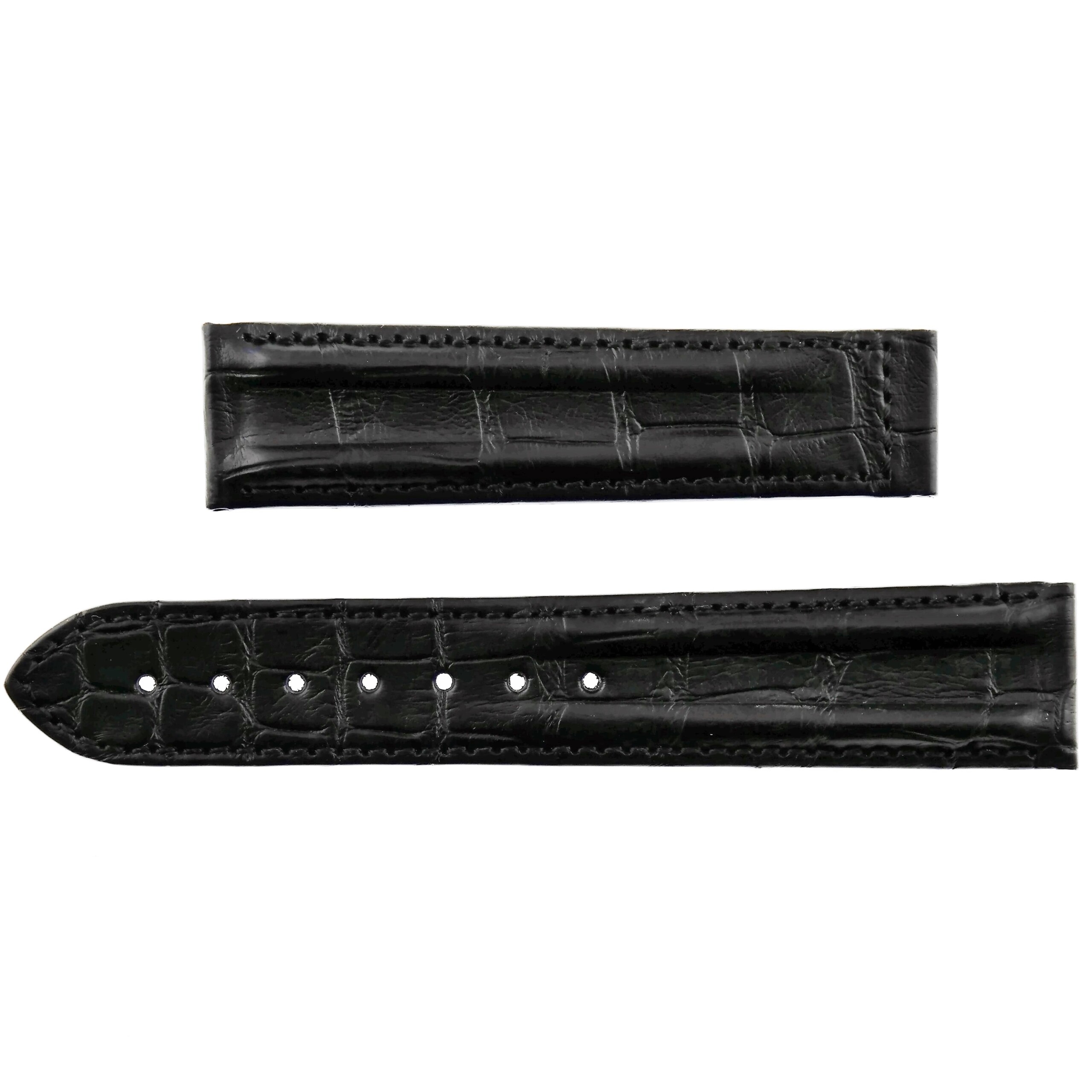 Black crocodile skin on leather, double ridged/ribbed reinforced, built for use with a deployant clasp (not included).