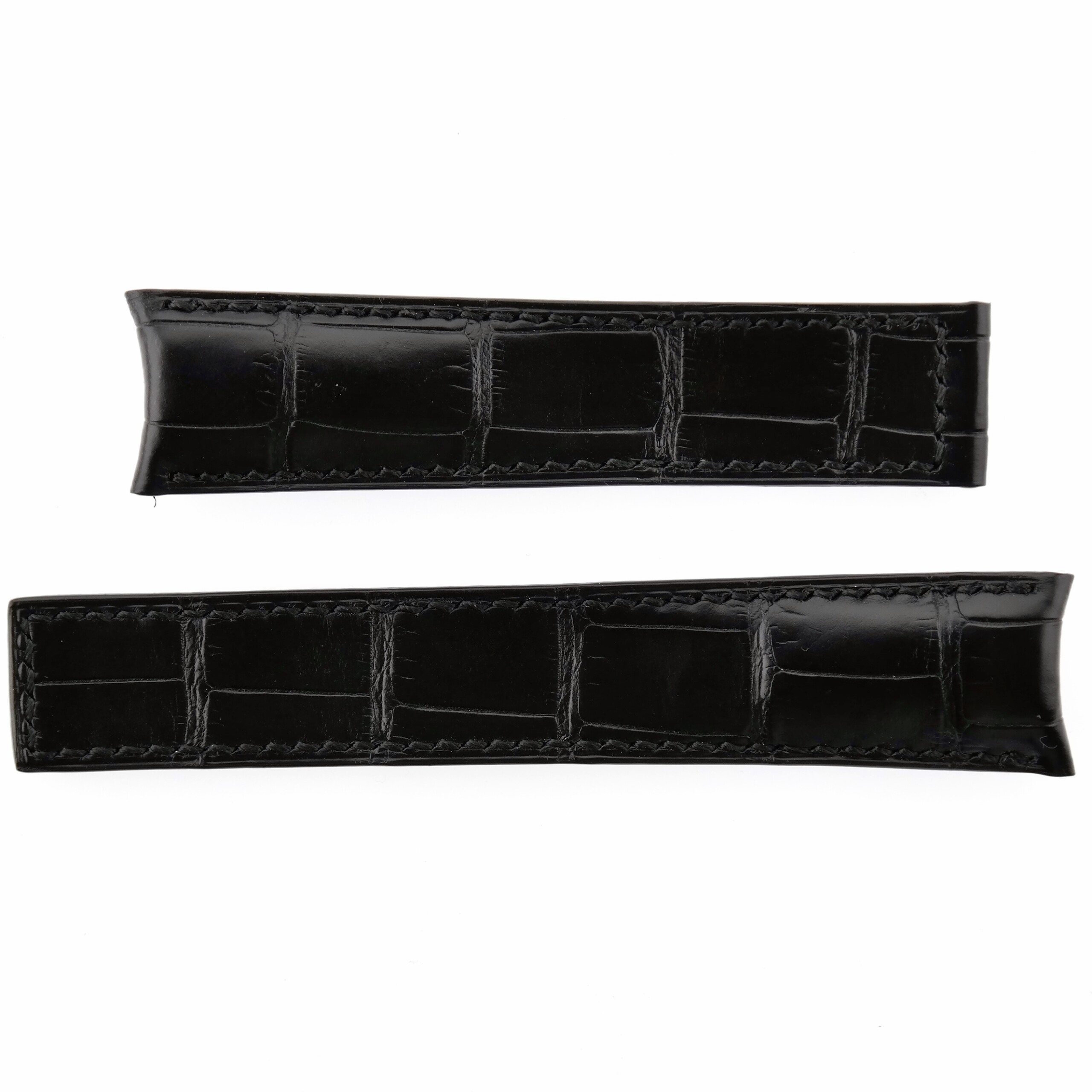 Black crocodile skin on genuine leather with black stitching, “cousu main” (hand-sewn), curved ends.