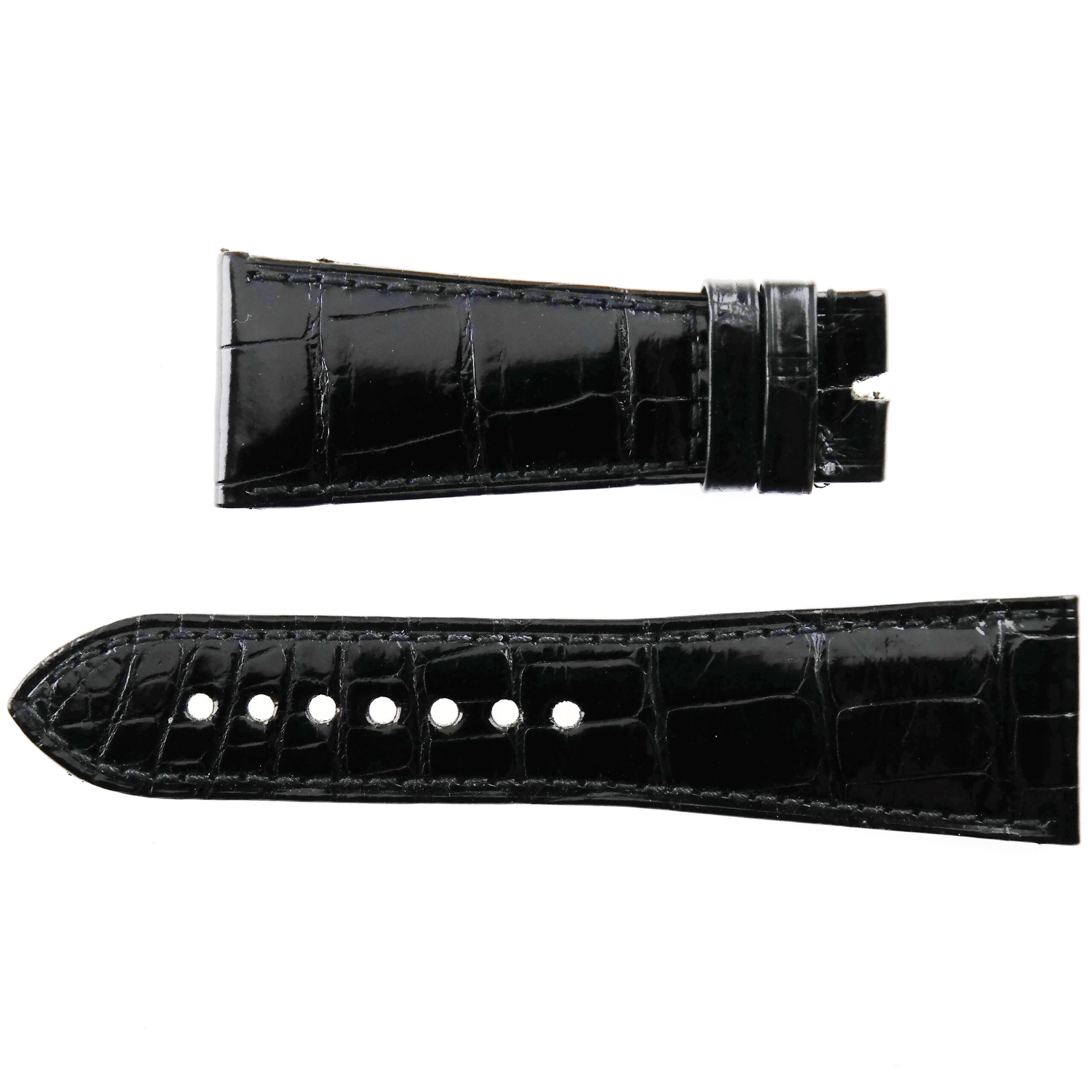 Black lacquered alligator skin on leather, black stitching.
