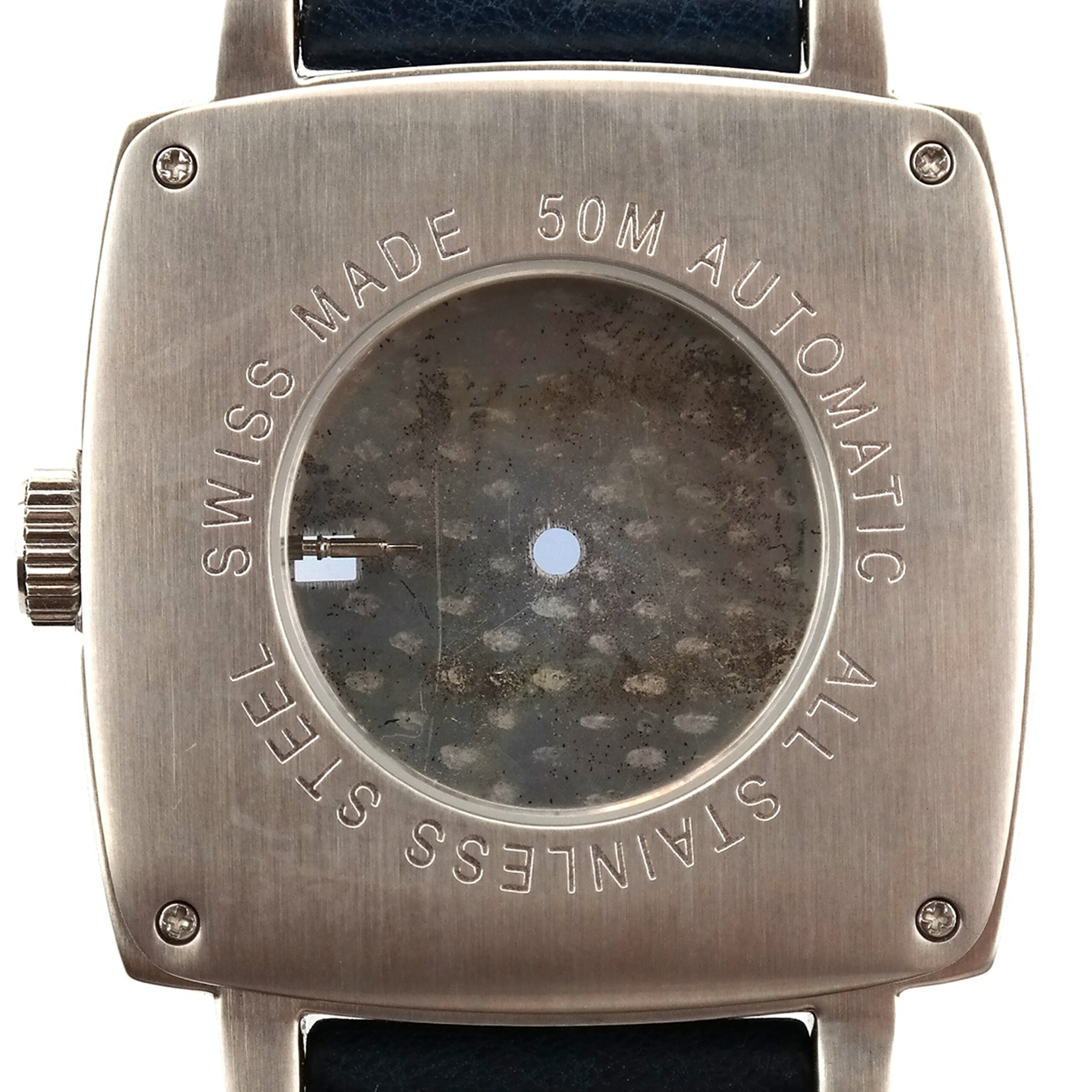 Brushed stainless steel see-thru case-back marked ALL STAINLESS STEEL | SWISS MADE | 50M | AUTOMATIC, secured by 4 screws.