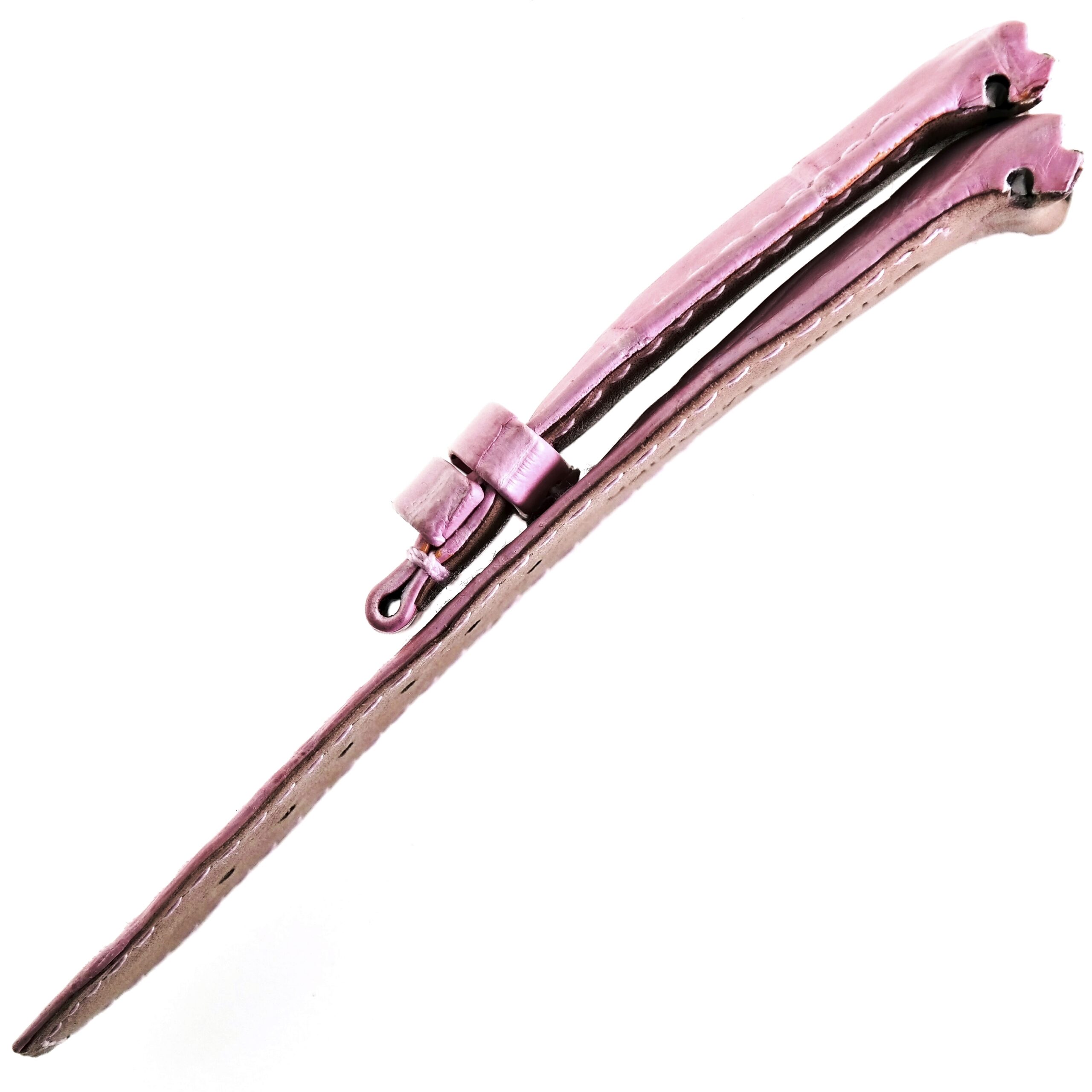 Pink alligator skin on leather, white stitching.