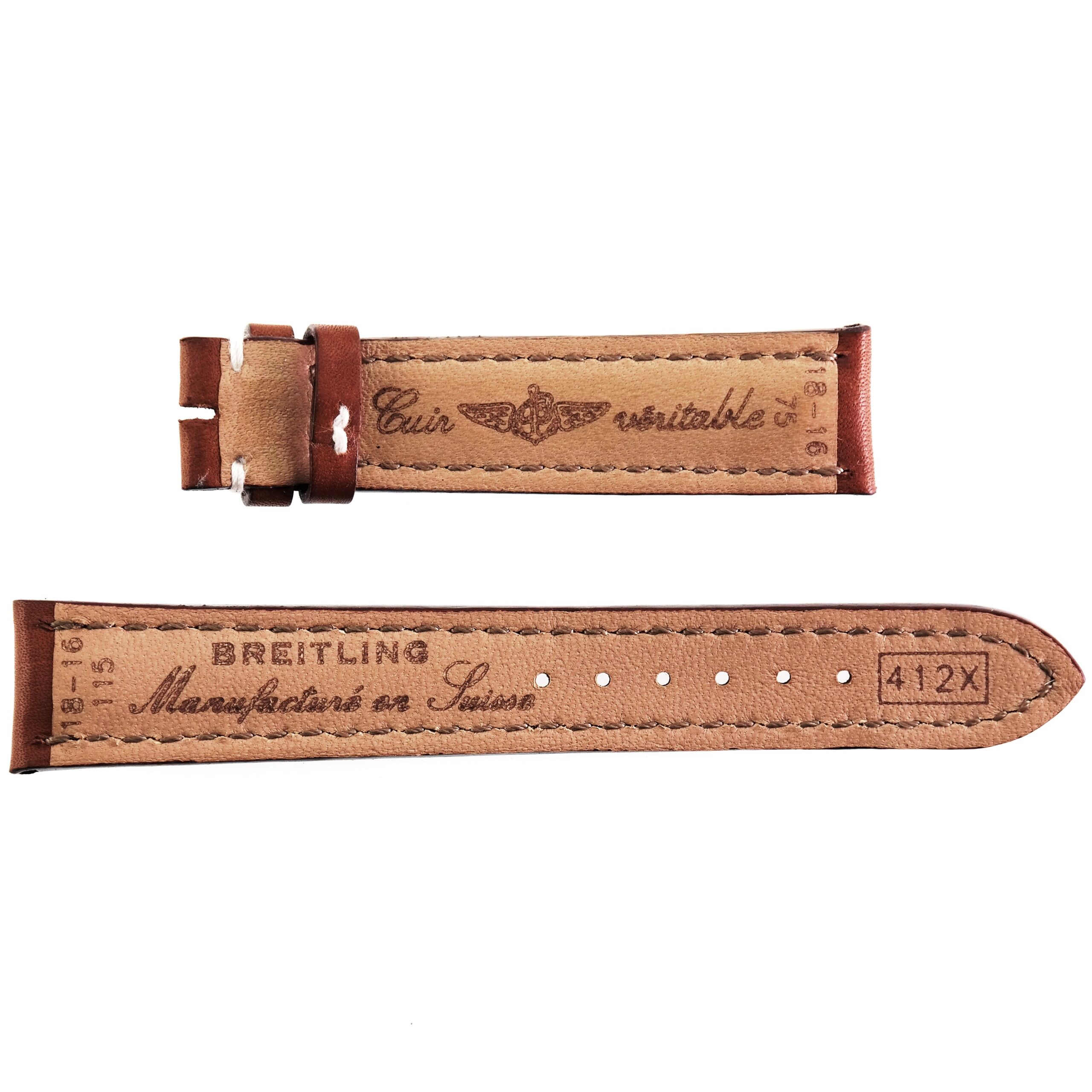 Strap marked BREITLING | 18-16 75 | Cuir veritable | 18-16 115 | Manufacture en Suisse | 412X.