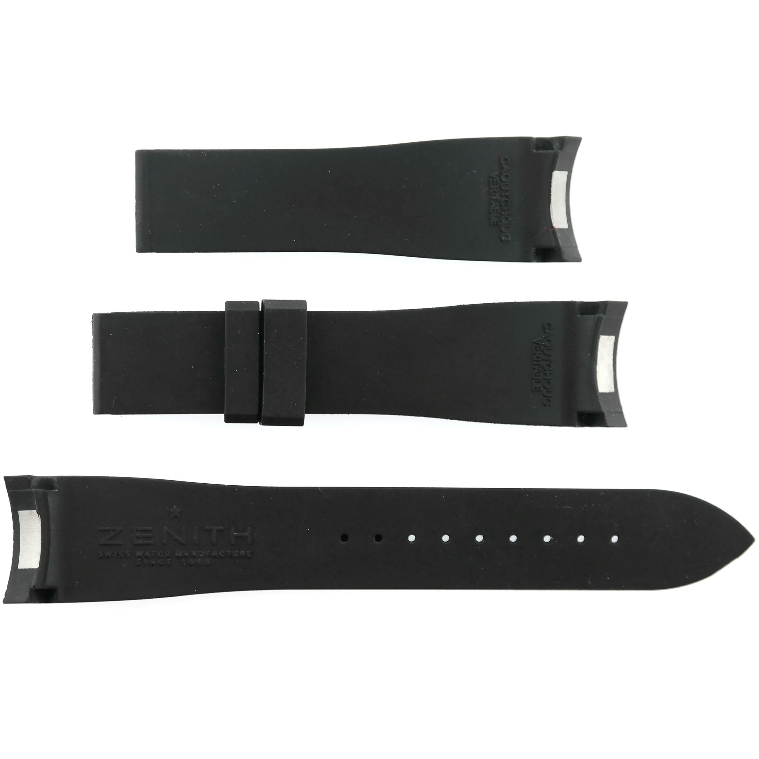 Strap marked ZENITH | CAOUTCHOUC VERITABLE | ZENITH | SWISS WATCH MANUFACTURE SINCE 1865.