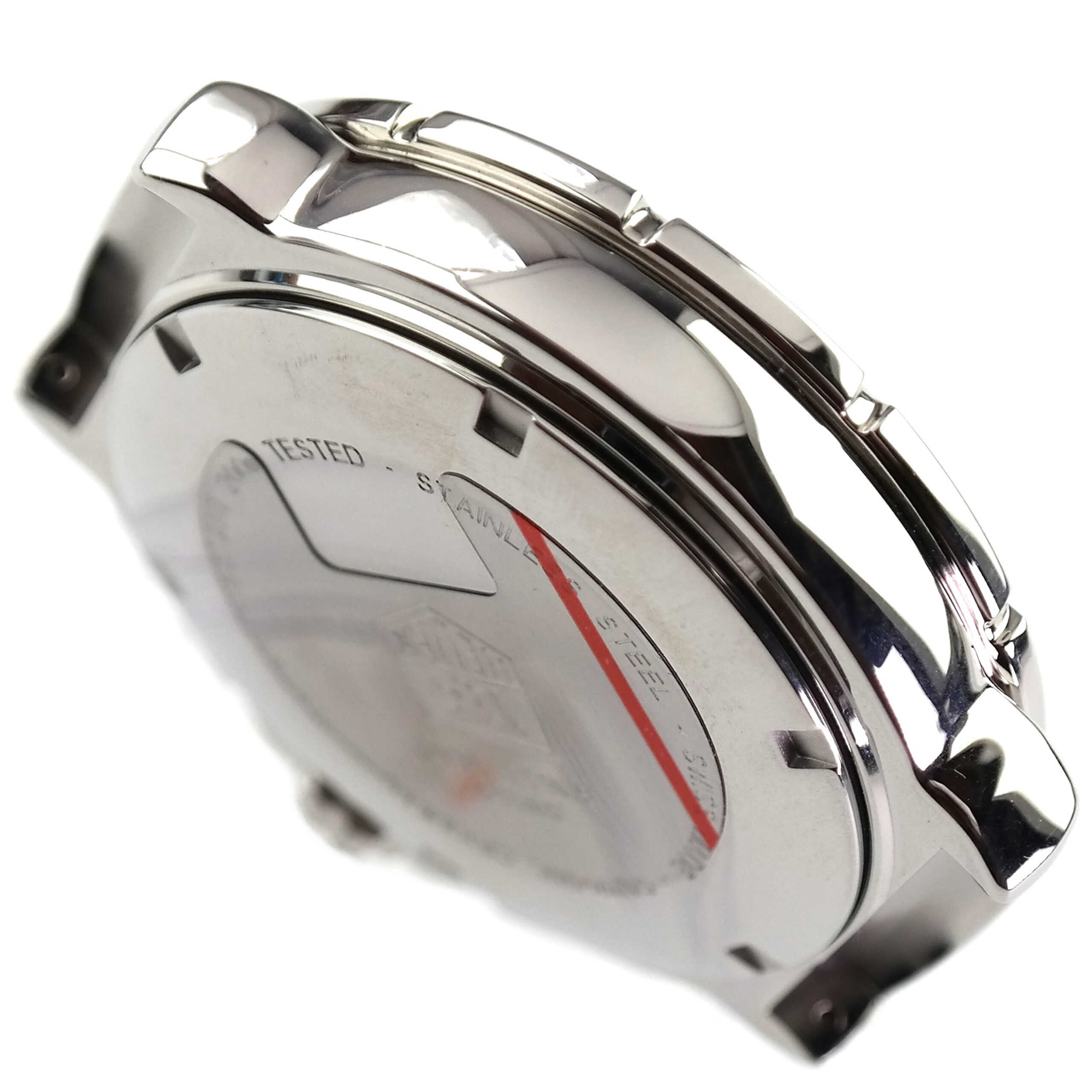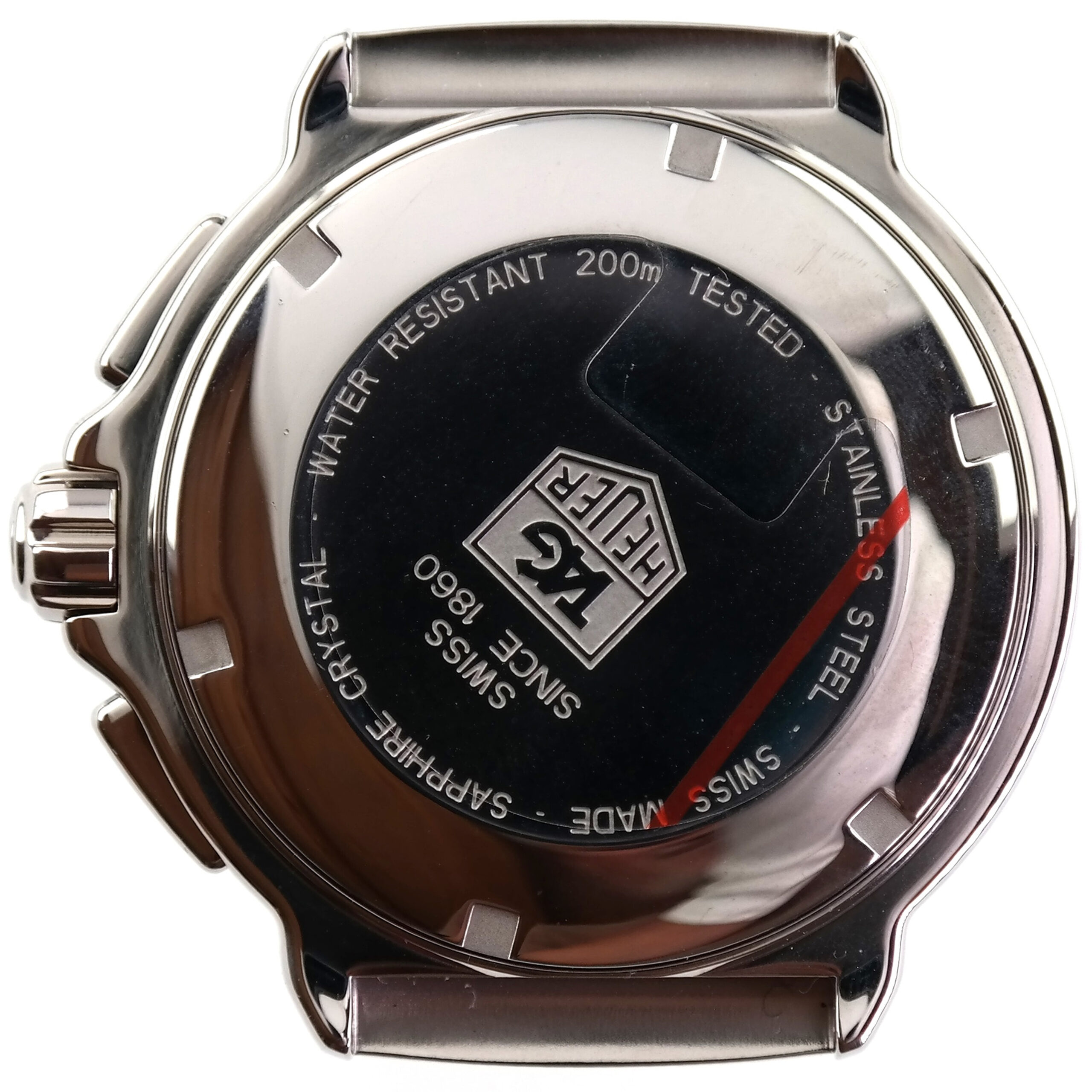 Case-back marked SWISS MADE | TAG HEUER | SWISS MADE SINCE 1860 | WATER RESISTANT 200m | TESTED | STAINLESS STEEL | SAPPHIRE CRYSTAL.