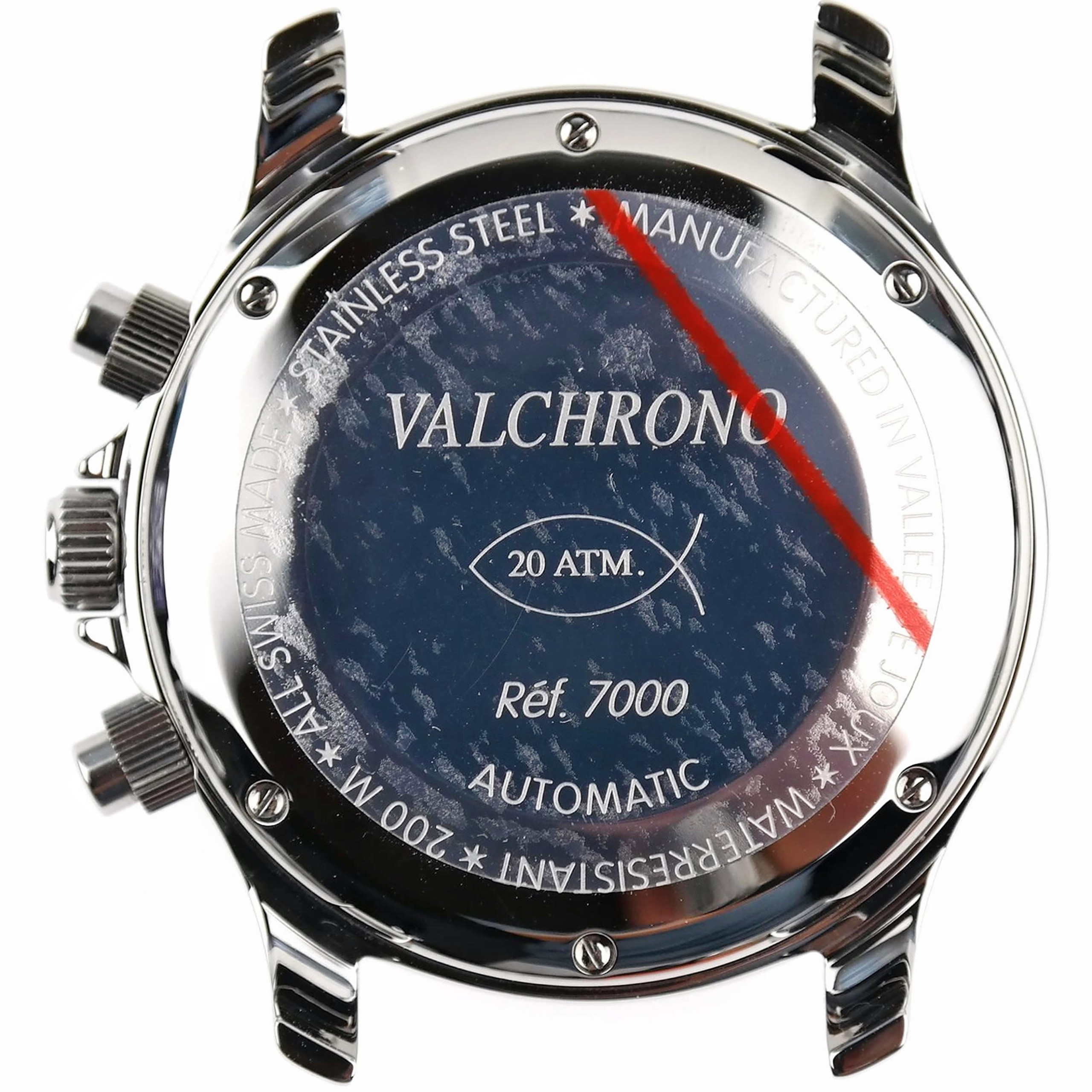 Marked STAINLESS STEEL | MANUFACTURED IN VALEE DE JOUX | WATERRESISTANT 200 M | ALL SWISS MADE | VALCHRONO | 20 ATM. | Ref. 7000 | AUTOMATIC
