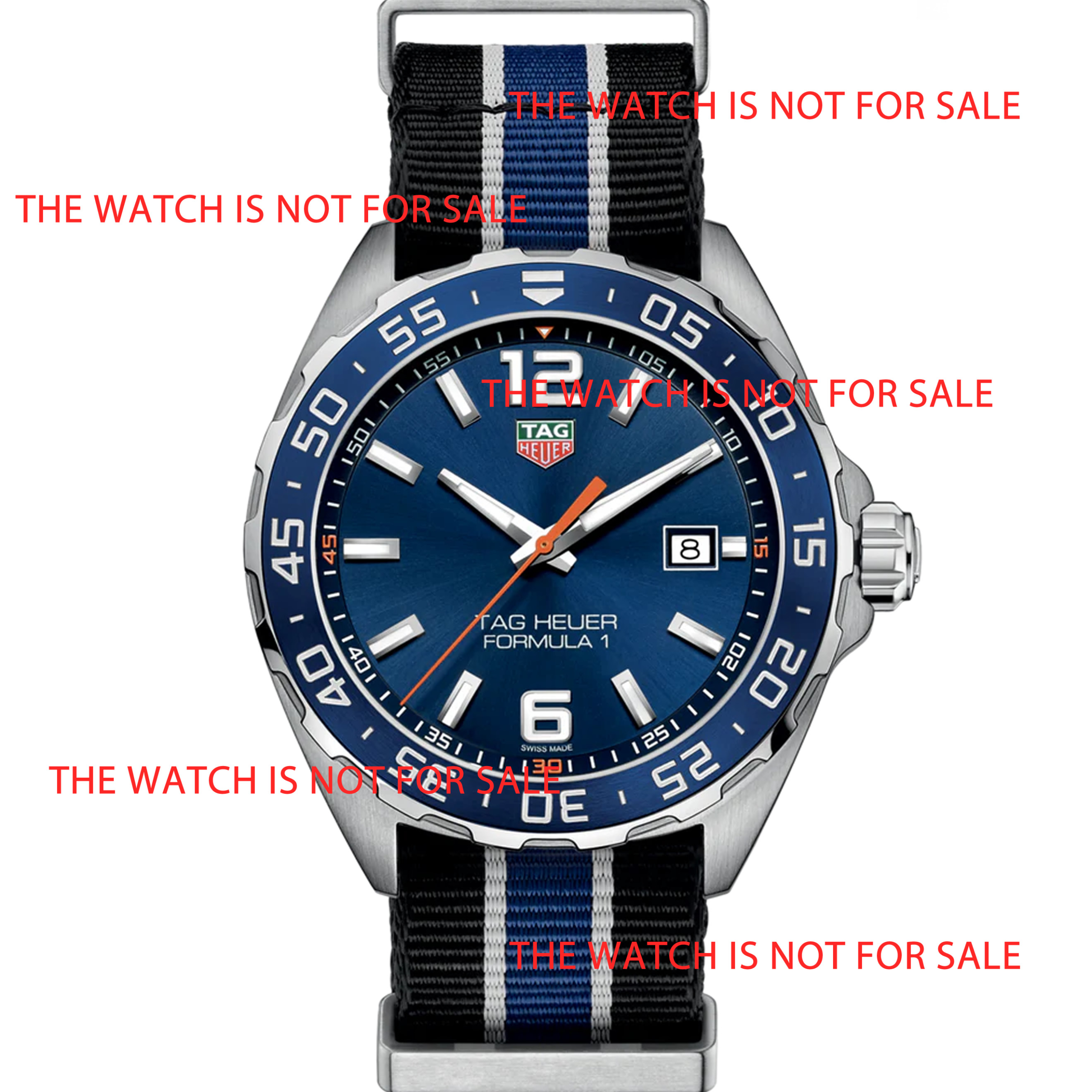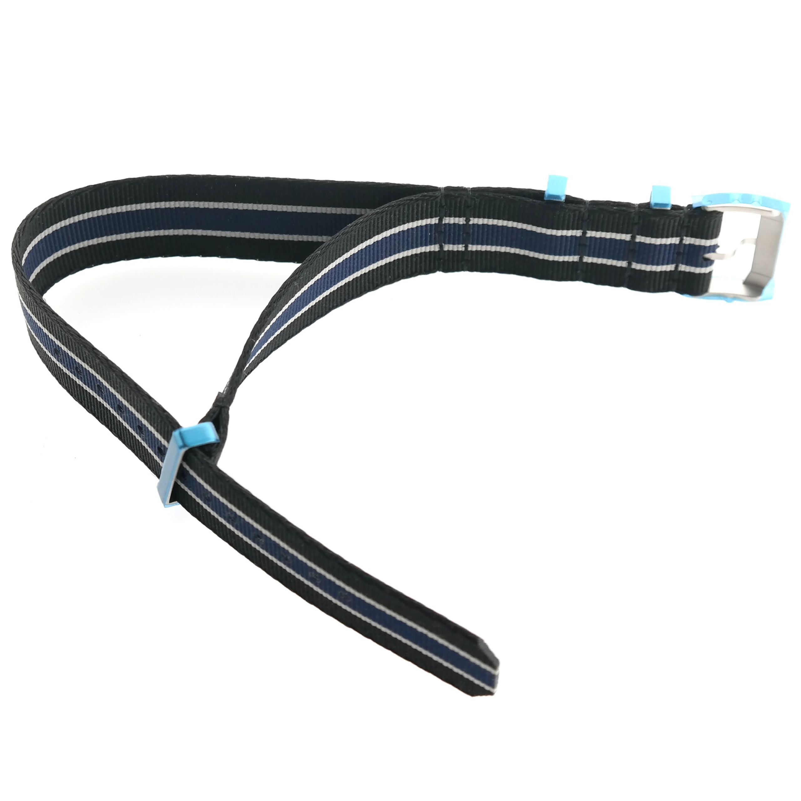 Black with blue and white stripes strap, with brushed stainless steel buckle, with its distinctive TAG Heuer logo.