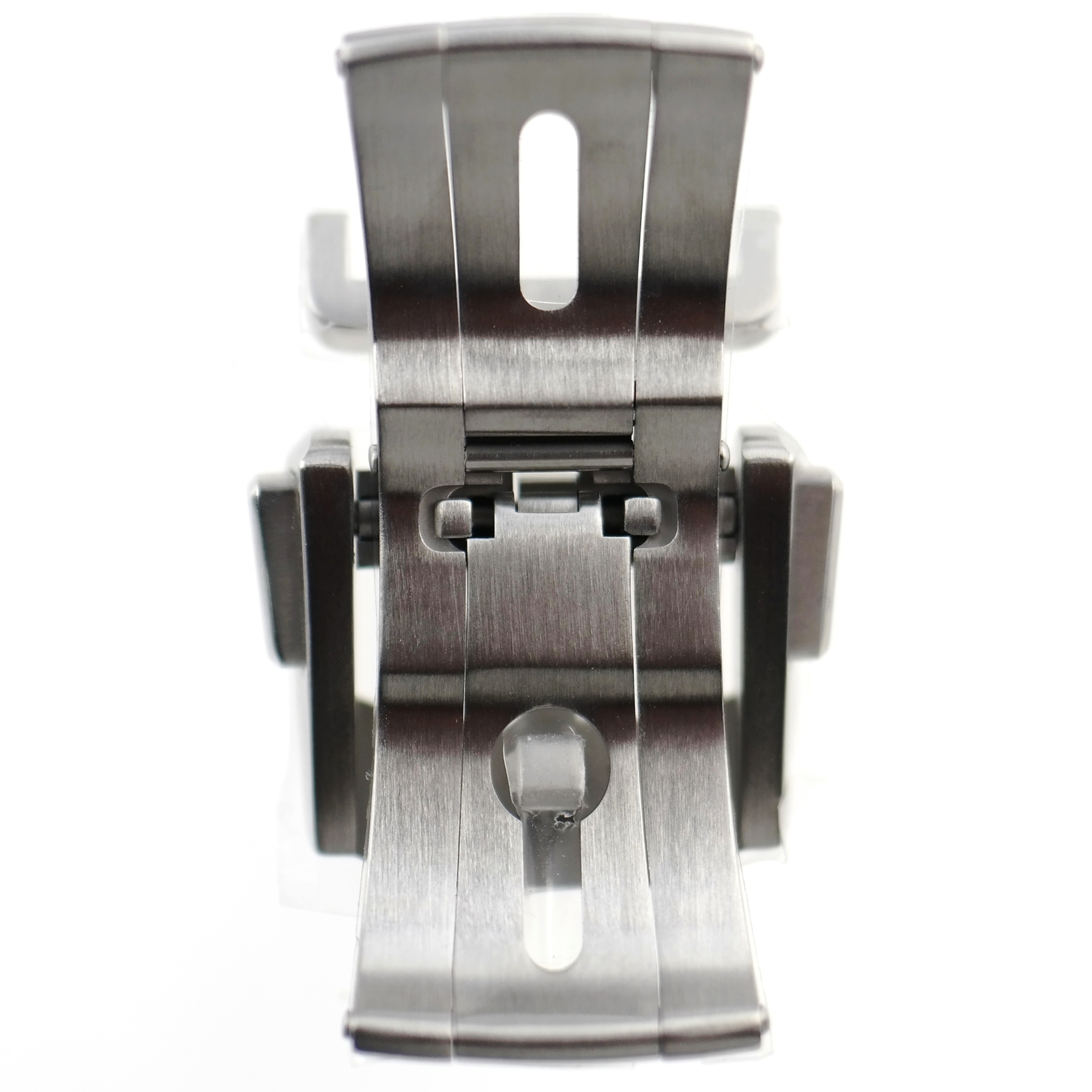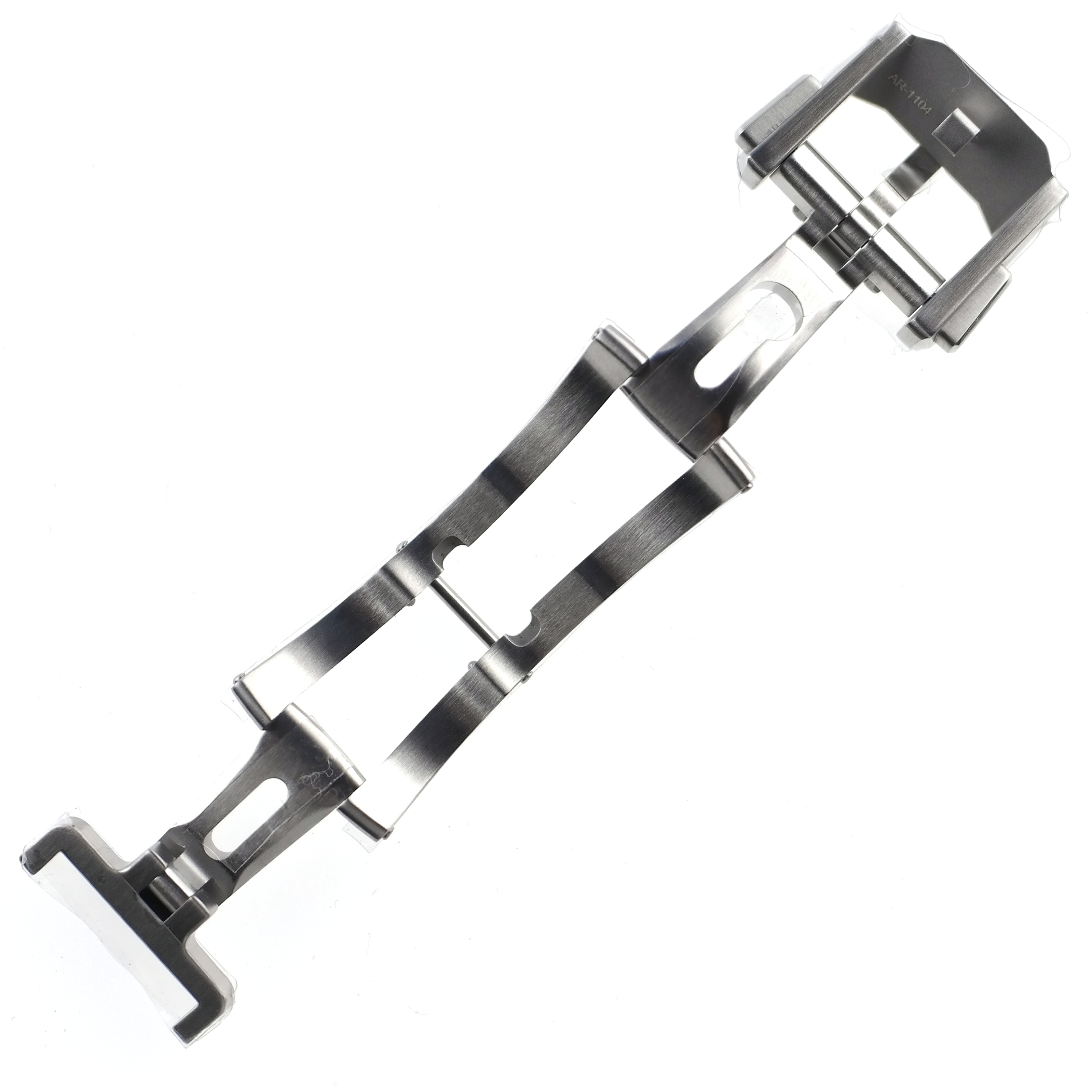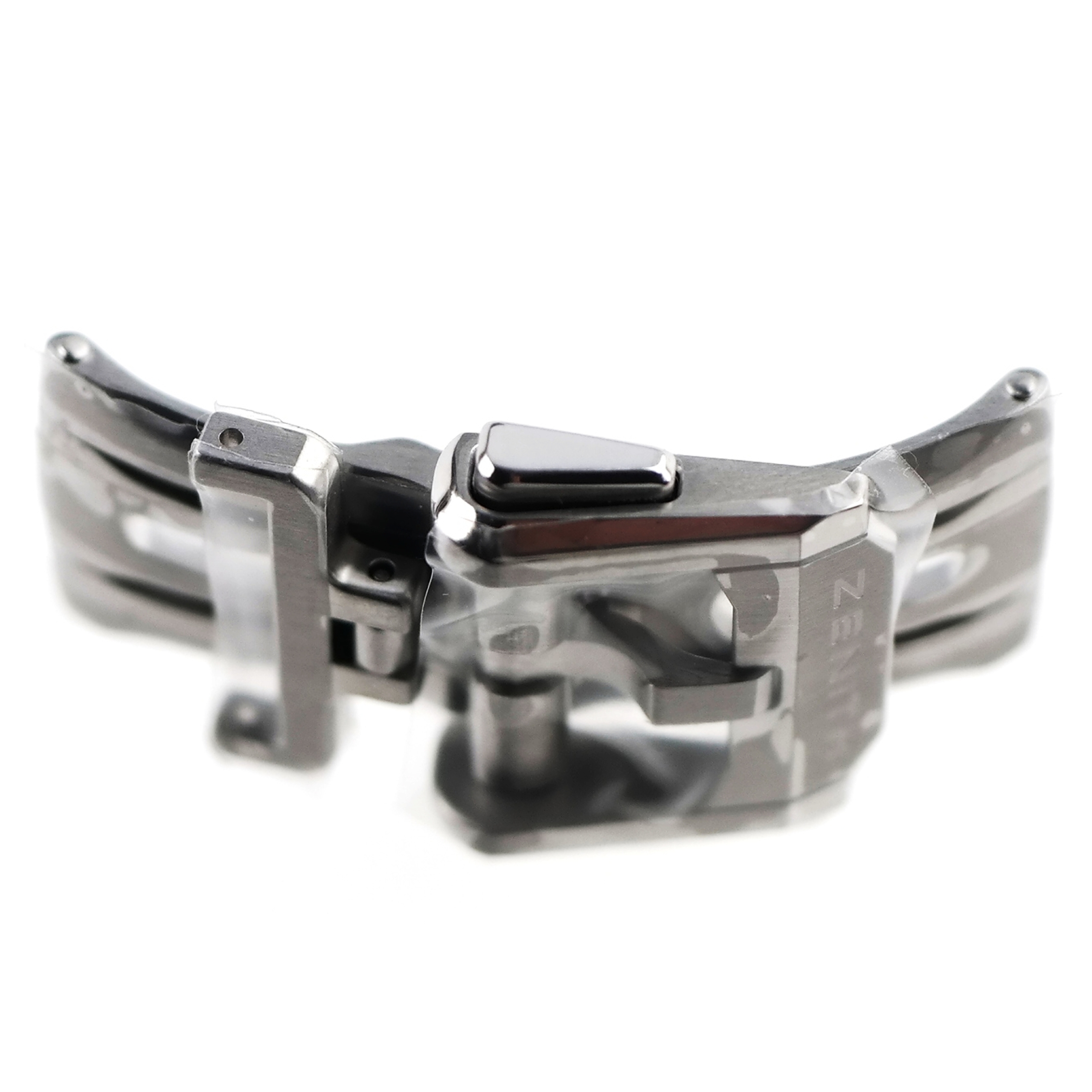 The “butterfly” type deployant clasp buckle is made of brushed/polished stainless steel.
